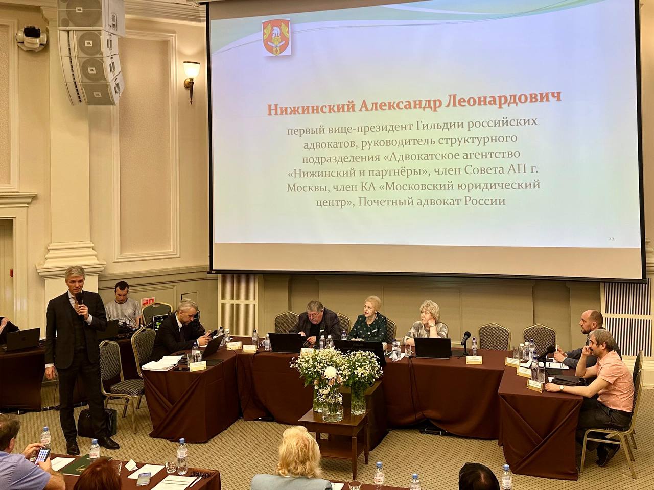 Затем присутствующие заслушали доклад Нижинского Александра Леонардовича, первого вице-президента Гильдии российских адвокатов, первого заместителя председателя Президиума коллегии адвокатов «Московский юридический центр», Почетного адвоката России по теме «Современные корпоративные отношения в НКО на примере адвокатских и нотариальных палат».