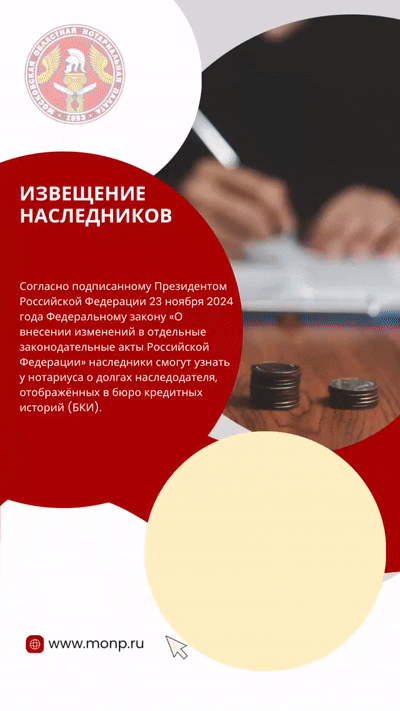 Согласно подписанному Президентом Российской Федерации 23 ноября 2024 года Федеральному закону «О внесении изменений в отдельные законодательные акты Российской Федерации» наследники смогут узнать у нотариуса о долгах наследодателя, отображённых в бюро кредитных историй (БКИ).