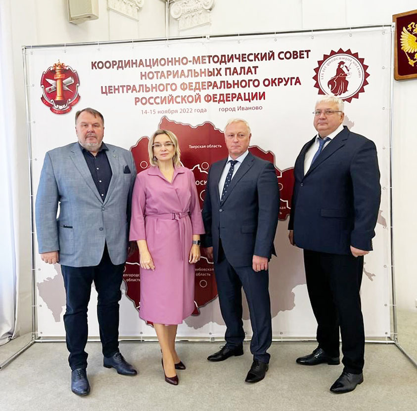 Довожу до Вашего сведения, что 14-15 ноября 2022 года на базе Ивановской областной нотариальной палаты состоялось очередное заседание Координационно-методического совета нотариальных палат Центрального федерального округа Российской Федерации. От нашей палаты в заседании приняли участие: Вице-президент МоНП Тягло Леонид Викторович; члены Правления МоНП: Бондарева Людмила Алексеевна, Рождественский Юрий Владимирович; Председатель Ревизионной комиссии МоНП Тарасенко Александр Михайлович.