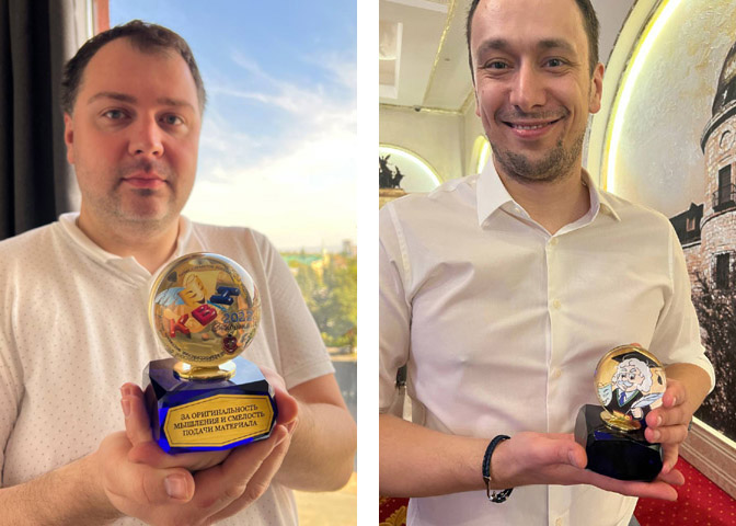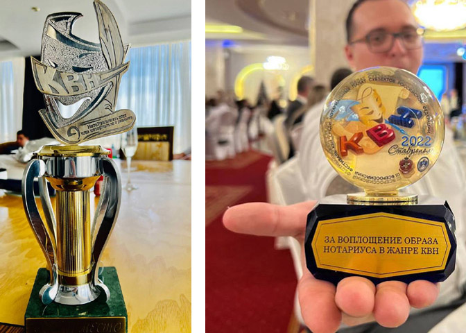 Специальные призы-кубки получили также участники команды МоНПансье: в номинации «За воплощение образа нотариуса в жанре КВН» – Андрей Радаев, в номинации «За оригинальность мышления и смелость подачи материала» – Сергей Бурмистров, специальный приз за исполнение роли Калиостро – Егор Мусс.