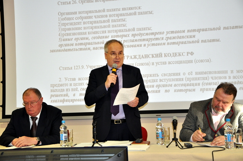 12 февраля перед нотариусами выступил генеральный директор компании «Триасофт» А.Н. Гусев. Он рассказал о новой разработке компании, веб-портале «Информационный нотариат», показал примеры по его использованию с целью улучшения информационного обеспечения нотариальной деятельности. Затем присутствующим была показана видеозапись телеконференции с нотариальными палатами субъектов РФ, состоявшаяся 25 января 2017 года, посвящённая применению приказа Министерства юстиции России от 27.12 2016 № 313 «Об утверждении форм реестров регистрации нотариальных действий, нотариальных свидетельств, удостоверительных надписей на сделках и свидетельствуемых документах и порядка их оформления». Состоялся обмен мнениями по вопросам применения Приказа Министра.