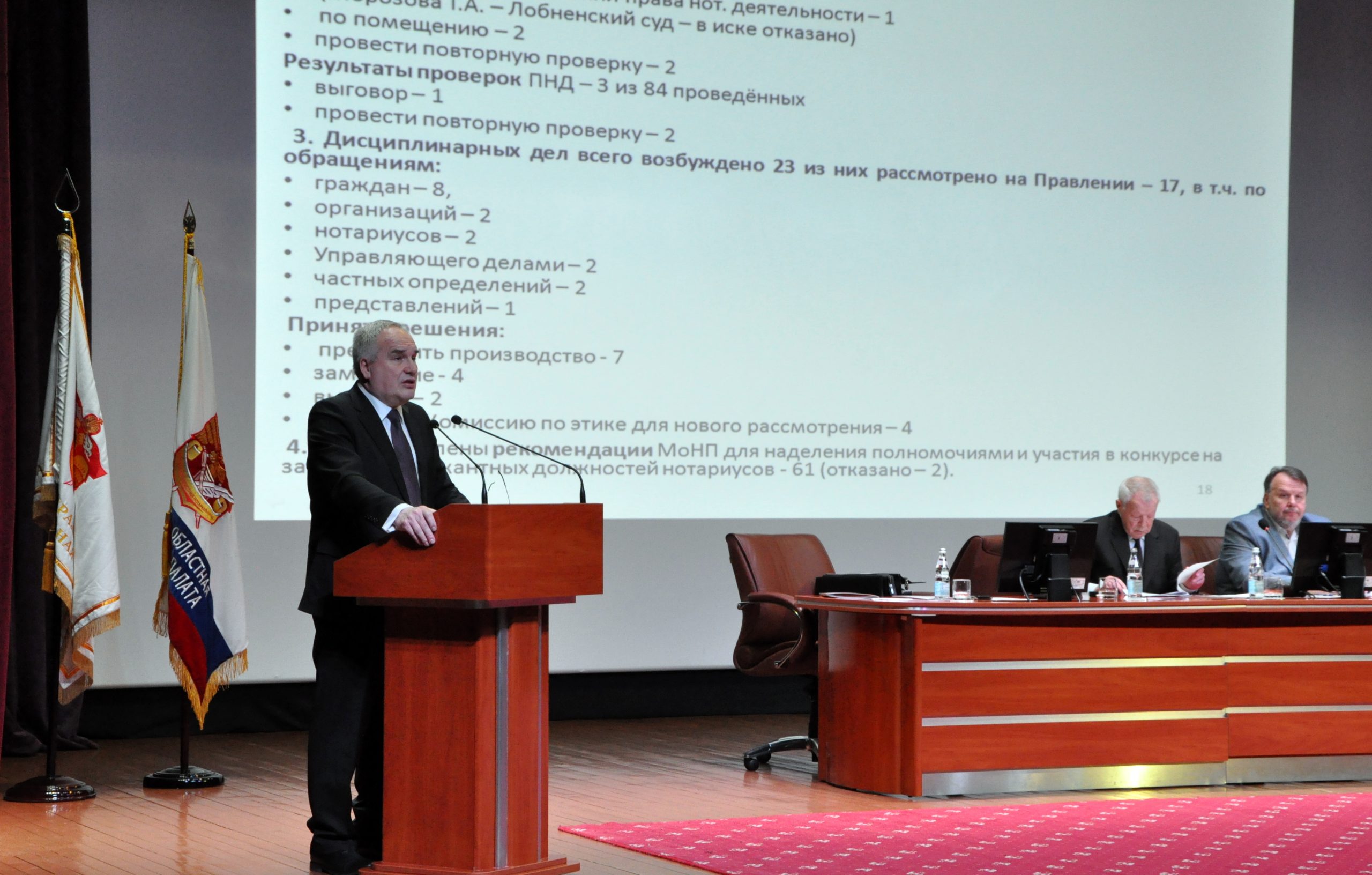 На собрании с отчётом о работе Президента и Правления Ассоциации нотариусов «Московская областная Нотариальная Палата» за 2017 год выступил Президент МоНП С.В. Смирнов.