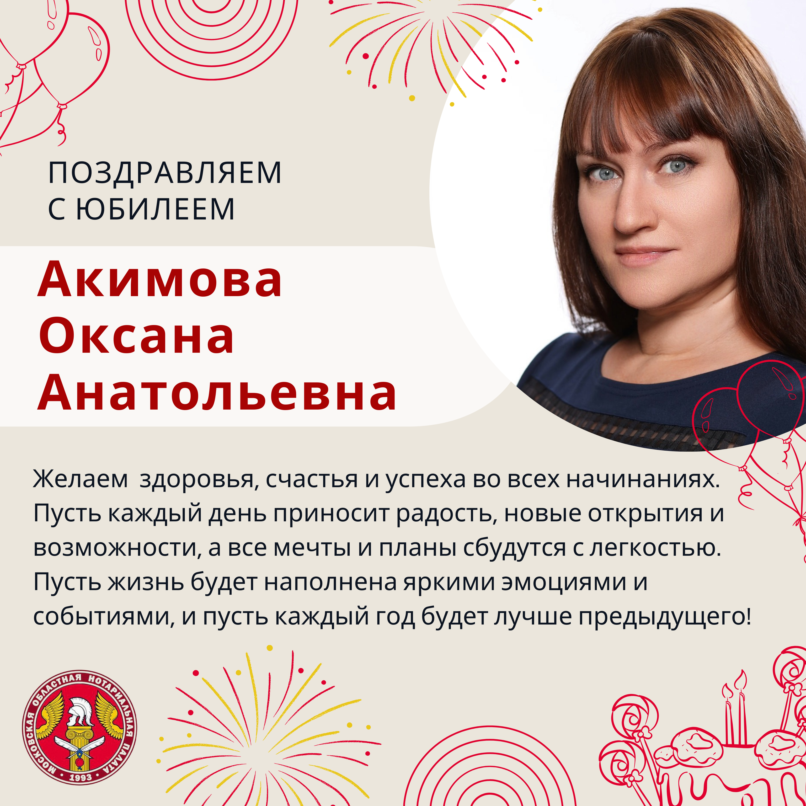 Поздравляем с Юбилеем Акимову Оксану Анатольевну