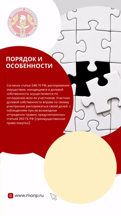 Участник долевой собственности вправе по своему усмотрению продать, подарить, завещать, отдать в залог свою долю либо распорядиться ею иным образом с соблюдением при ее возмездном отчуждении правил, предусмотренных статьей 250 Гражданского кодекса Российской Федерации (преимущественное право покупки).