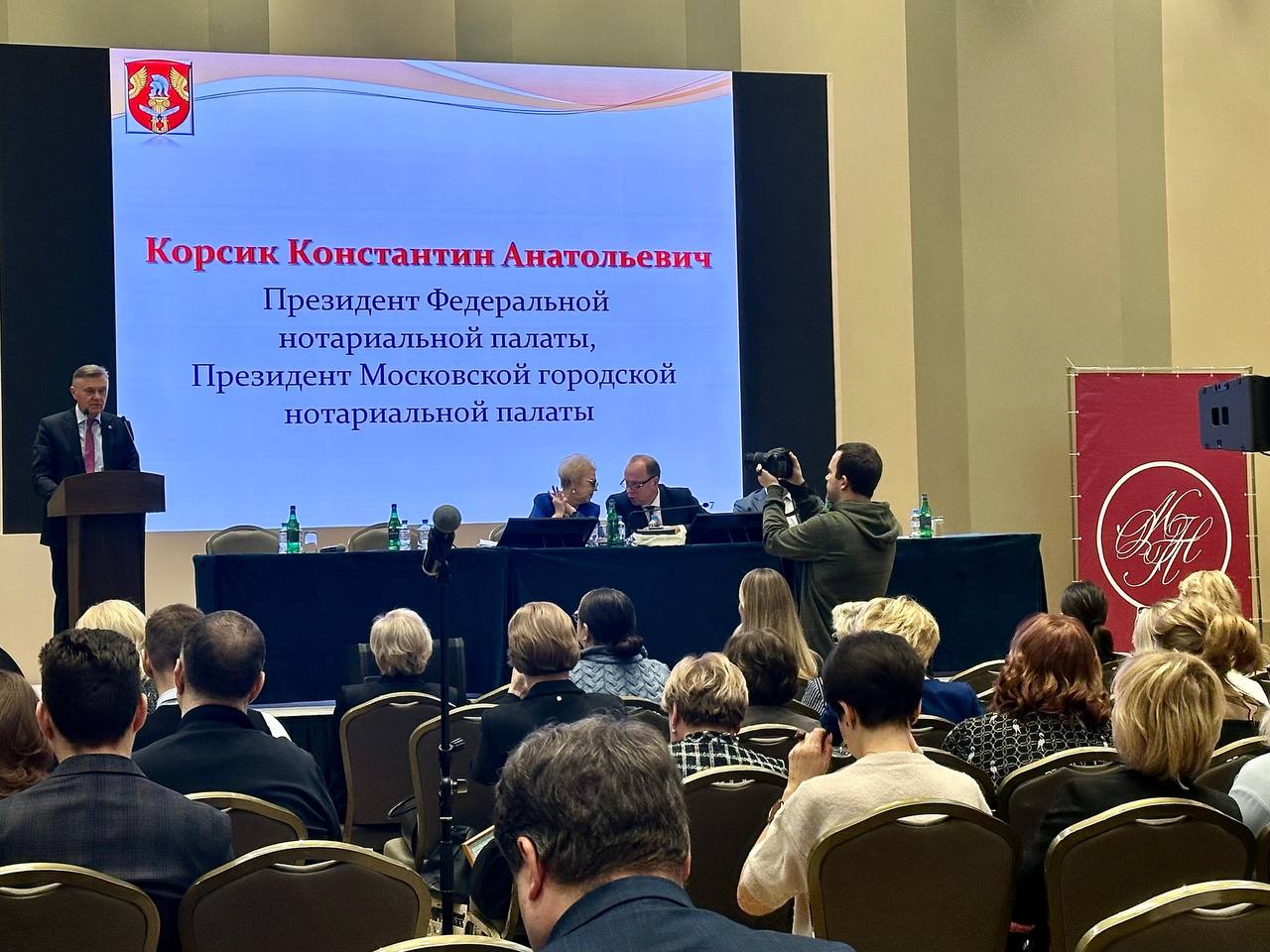 Президент ФНП Константин Анатольевич Корсик в своем выступлении поблагодарил Московскую областную Нотариальную Палату за ответственную и результативную работу в 2025 и обратил внимание на дальнейшее активное развитие цифровизации нотариата, а также на особенности обязательного нотариального удостоверения сделок с недвижимостью между физическими лицами с целью защиты граждан от случаев мошенничества.