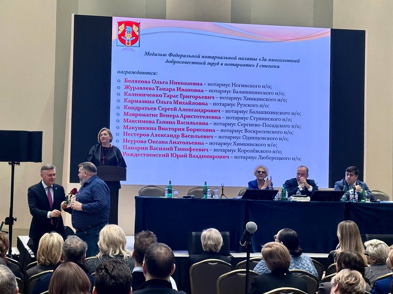 Первым с приветственным словом и благодарностью за квалифицированную работу к присутствующим обратился Михаил Юрьевич Зелепукин. Он отметил большой вклад нотариата Московской области в оказание бесплатной юридической помощи участникам СВО и членам их семей, для которых было совершено более 5000 нотариальных действий. Далее Михаил Юрьевич лично вручил заслуженные благодарности Министерства юстиции Российской Федерации по Московской области нотариусам Подмосковья.