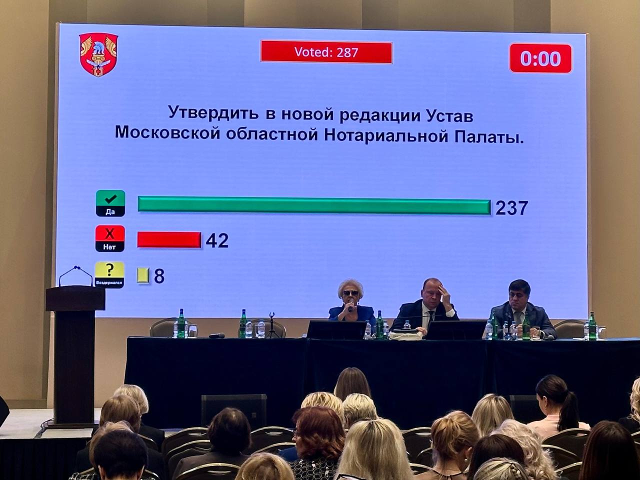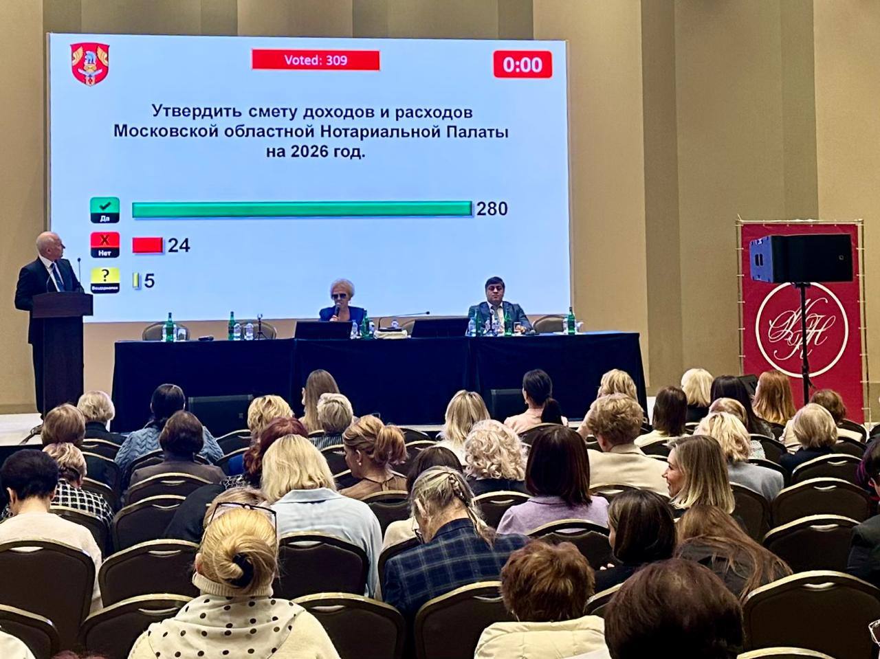 В собрании приняло участие 340 нотариусов Подмосковья. В повестку дня были включены вопросы утверждения сметы доходов и расходов МоНП на 2026 год, определения размера членских взносов, выбора счетной комиссии Общего собрания, новой редакции Устава Московской областной Нотариальной Палаты и другие вопросы деятельности палаты.